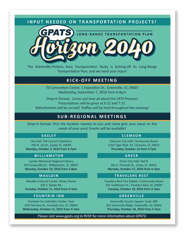 India Hook had the great pleasure of providing the branding for the Greenville-Pickens Area Transportation Study 2040 Long-Range Transportation Plan. The resulting design manual included application procedures for branding as well as marketing materials that were broadly applied.